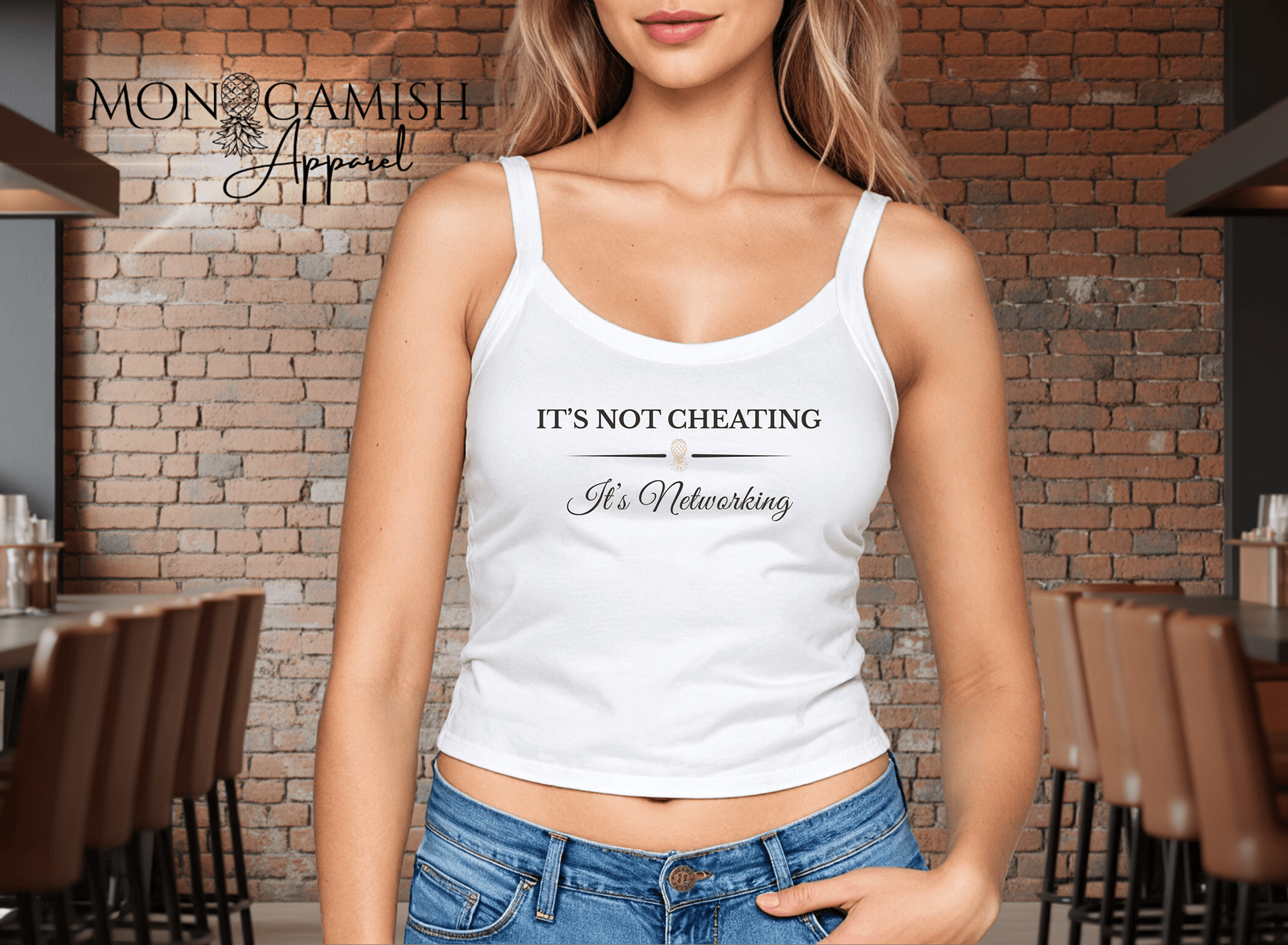 This ladies crop tank flips the script with a playful message: βItβs Not Cheating, Itβs Networking,β accented by a golden upside-down pineapple at the center. Bold lettering mixed with sultry script keeps the design equal parts classy and flirty, perfect for women who love to blur the line between business and pleasure. Ideal for club nights, lifestyle events, or casual hangs where sparks are meant to fly, this top is all about making the right connections.