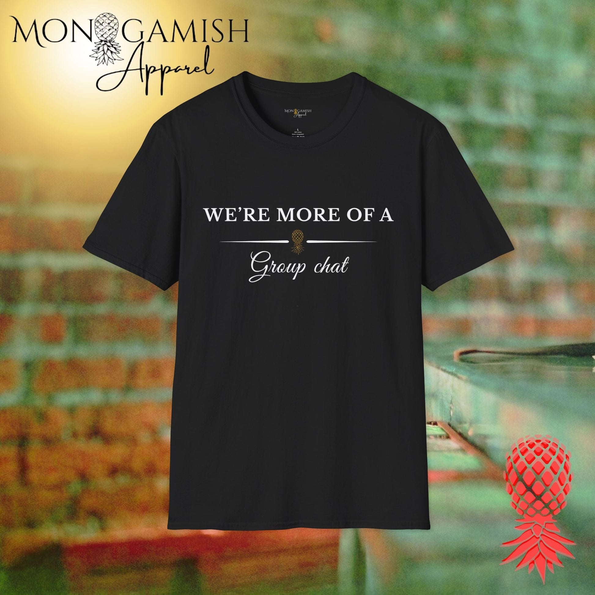 This unisex tee delivers a clever twist on modern connection with the phrase “We’re More of a Group Chat.” Clean lines, a balanced font pairing, and a subtle upside-down pineapple keep it classy, while the message does the heavy lifting for those in the know. It’s the perfect vibe for lifestyle socials, weekend events, or casual outings where you're signaling that your "group dynamic" is more than just digital.