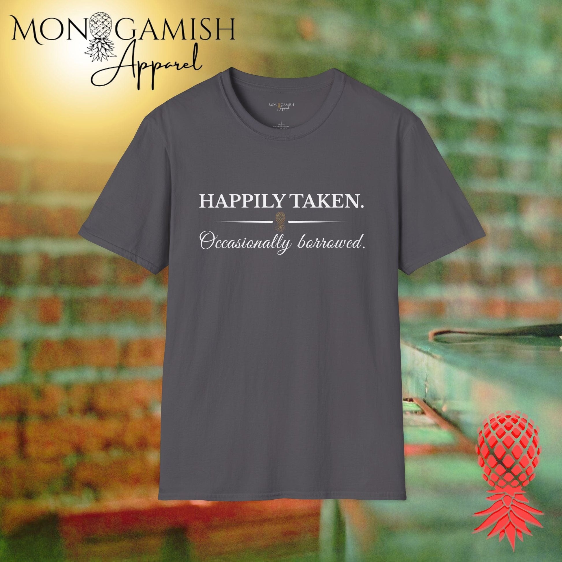 Sometimes the most honest shirts are also the most subtle. This tee was made for the monogamish, vacation-open, hall-pass-holding crowd who live happily partnered… and occasionally explored. With a clean serif up top, a soft script beneath, and a discreet upside-down pineapple to tie it all together, this design invites curiosity with class. Whether you're relaxing poolside or chatting over cocktails at a takeover, this shirt does the flirting so you don't have to.